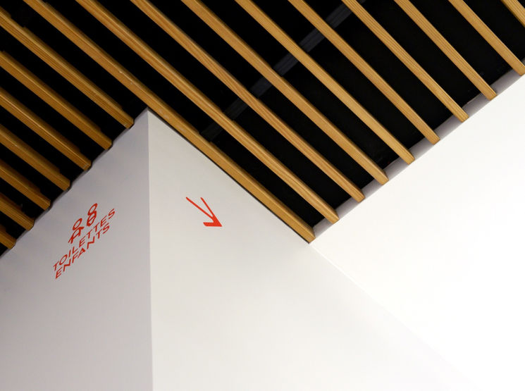 Les matériaux et la palette couleur de la signalétique a été travaillé en cohérence avec l’espace architectural.